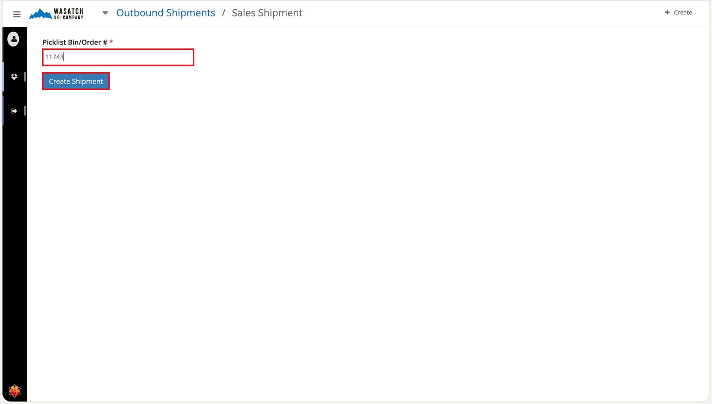 The Outbound Shipment creation screen opens (shown below). Enter the Order Number in the search field. The system automatically retrieves and displays the associated picklist details, including the bin number.