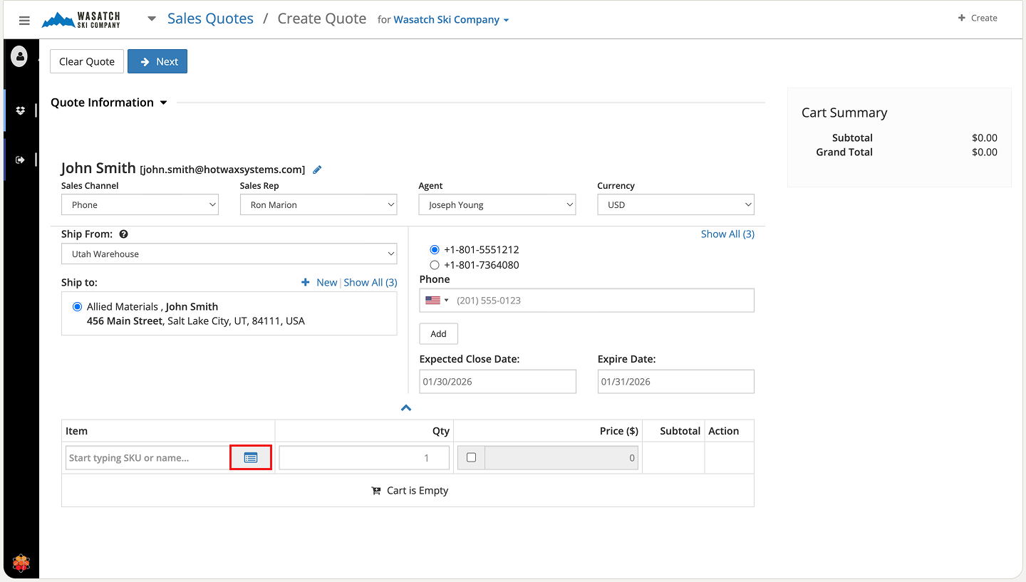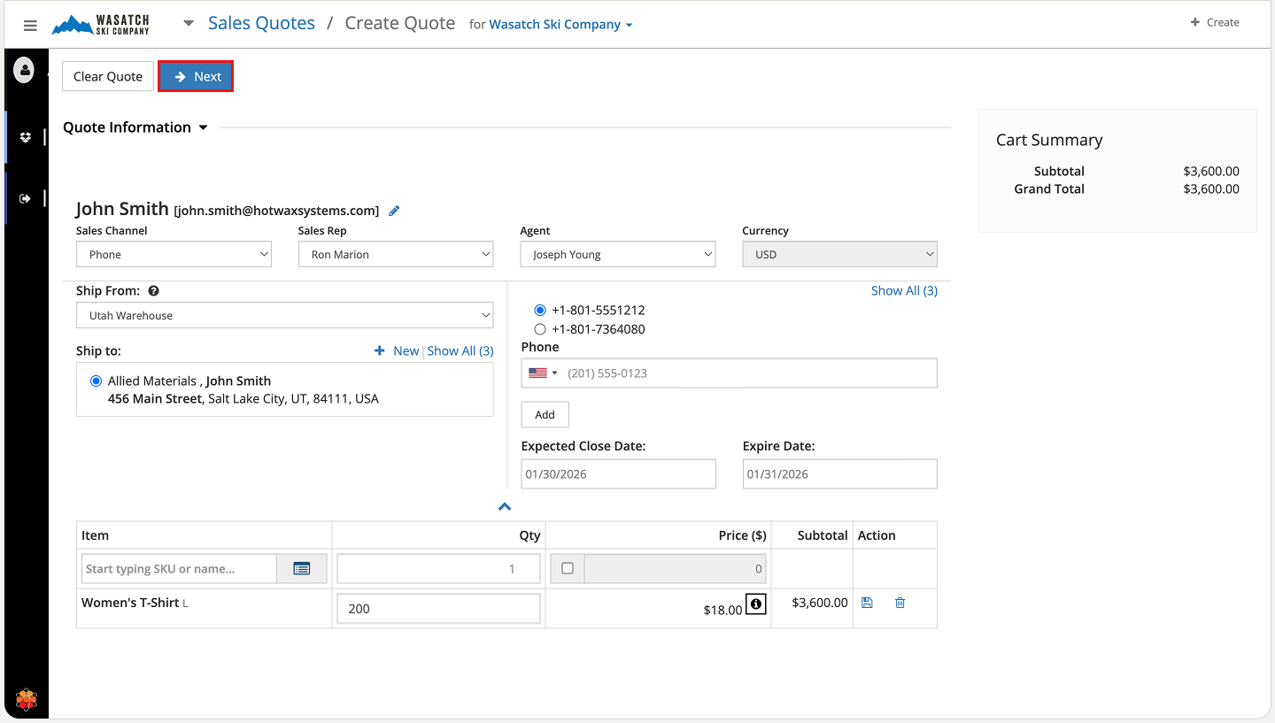 Back on the main quote screen, review the added items, quantities, and calculated totals. When satisfied, click Next to continue.