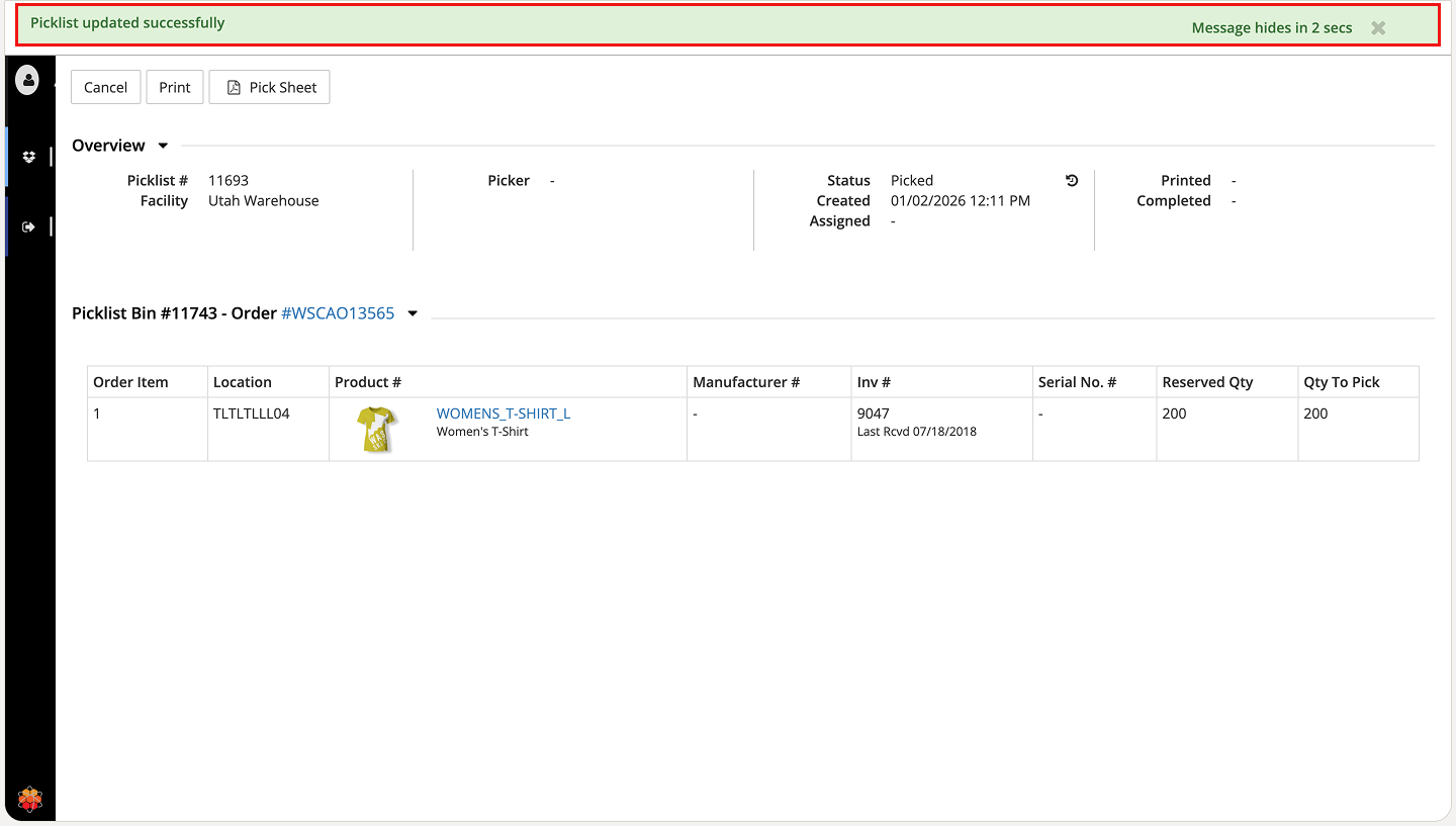 - Print Pick Sheet: Click Print to send the pick list directly to a printer for warehouse use.