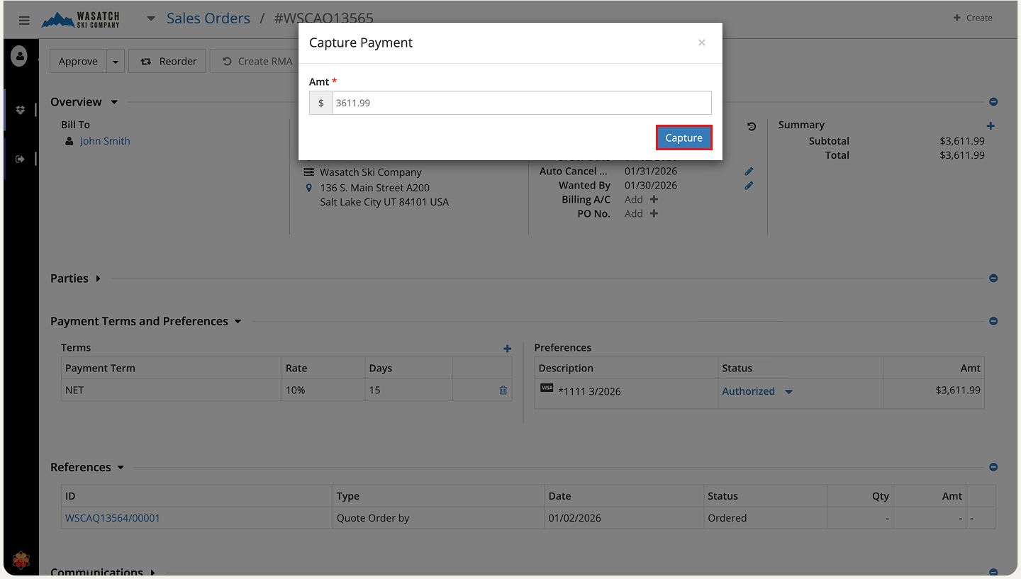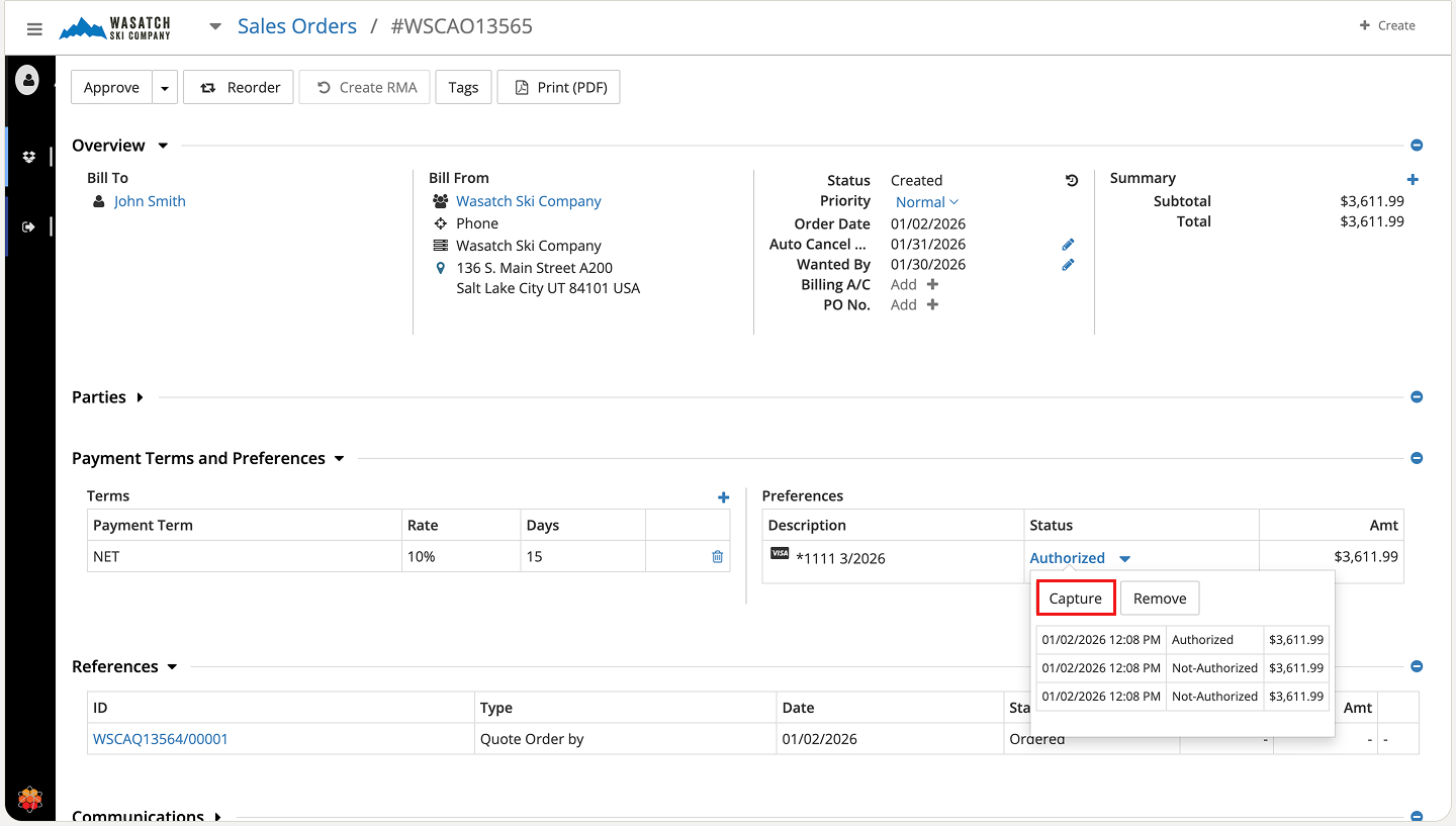 If payment is received upfront, click Capture under the Status column for the payment preference. Although this step is optional at this stage, we are doing it here for demonstration purposes.