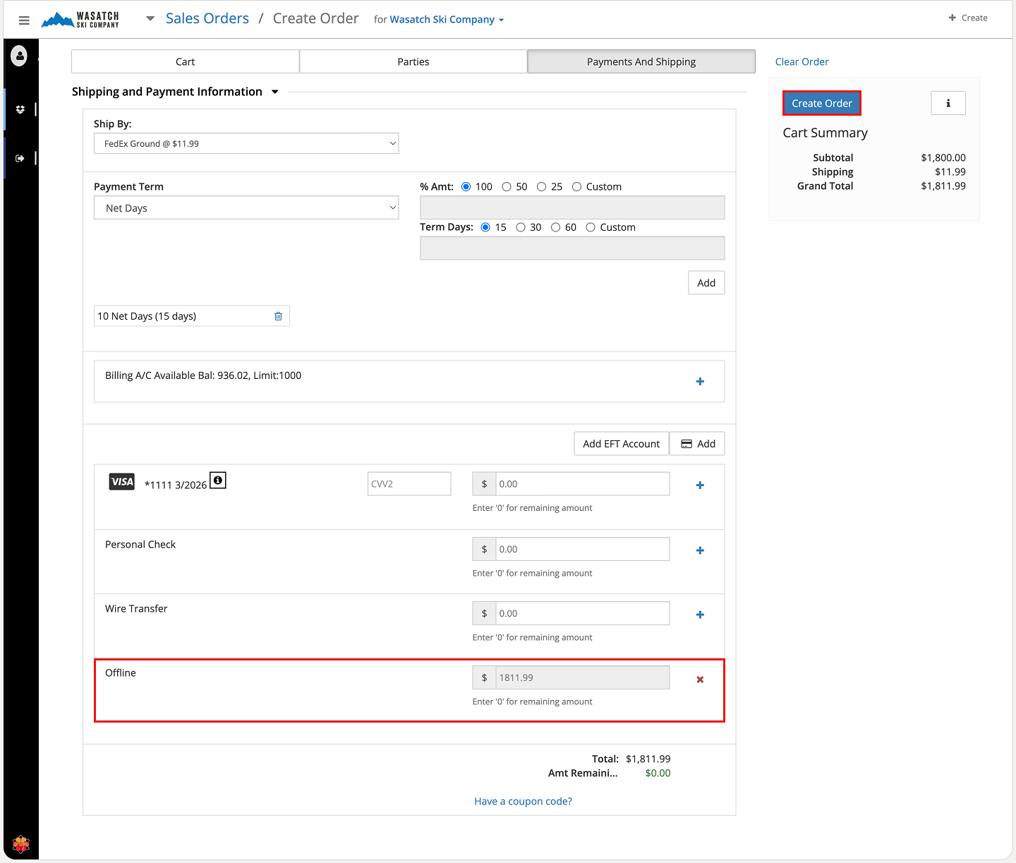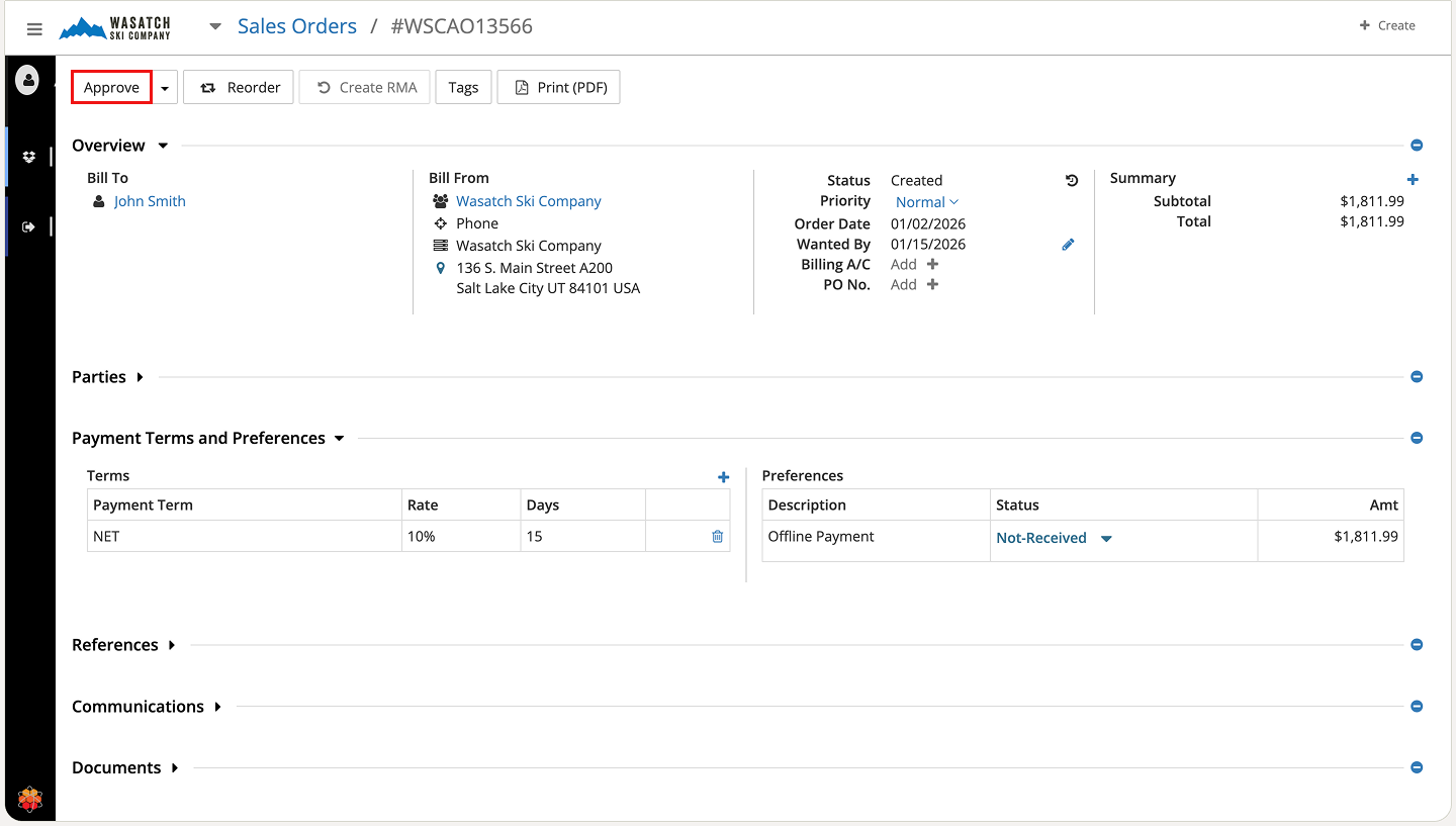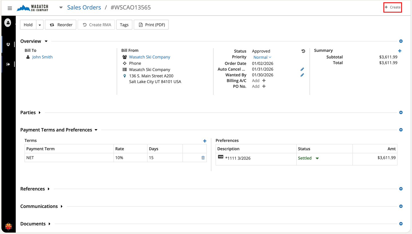 Once all details are confirmed, click Create Order. The order status advances, and now the sales order is ready for fulfillment processing.