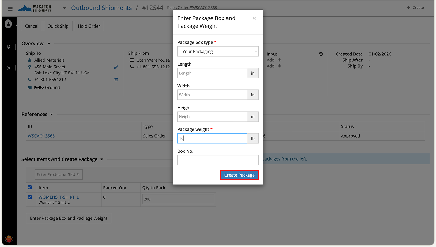 Once selected, click Enter Package Box and Package Weight to proceed. Accurate packaging details are essential for obtaining precise carrier rates through integration.