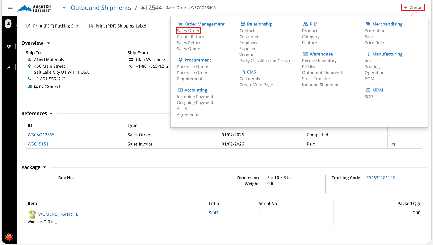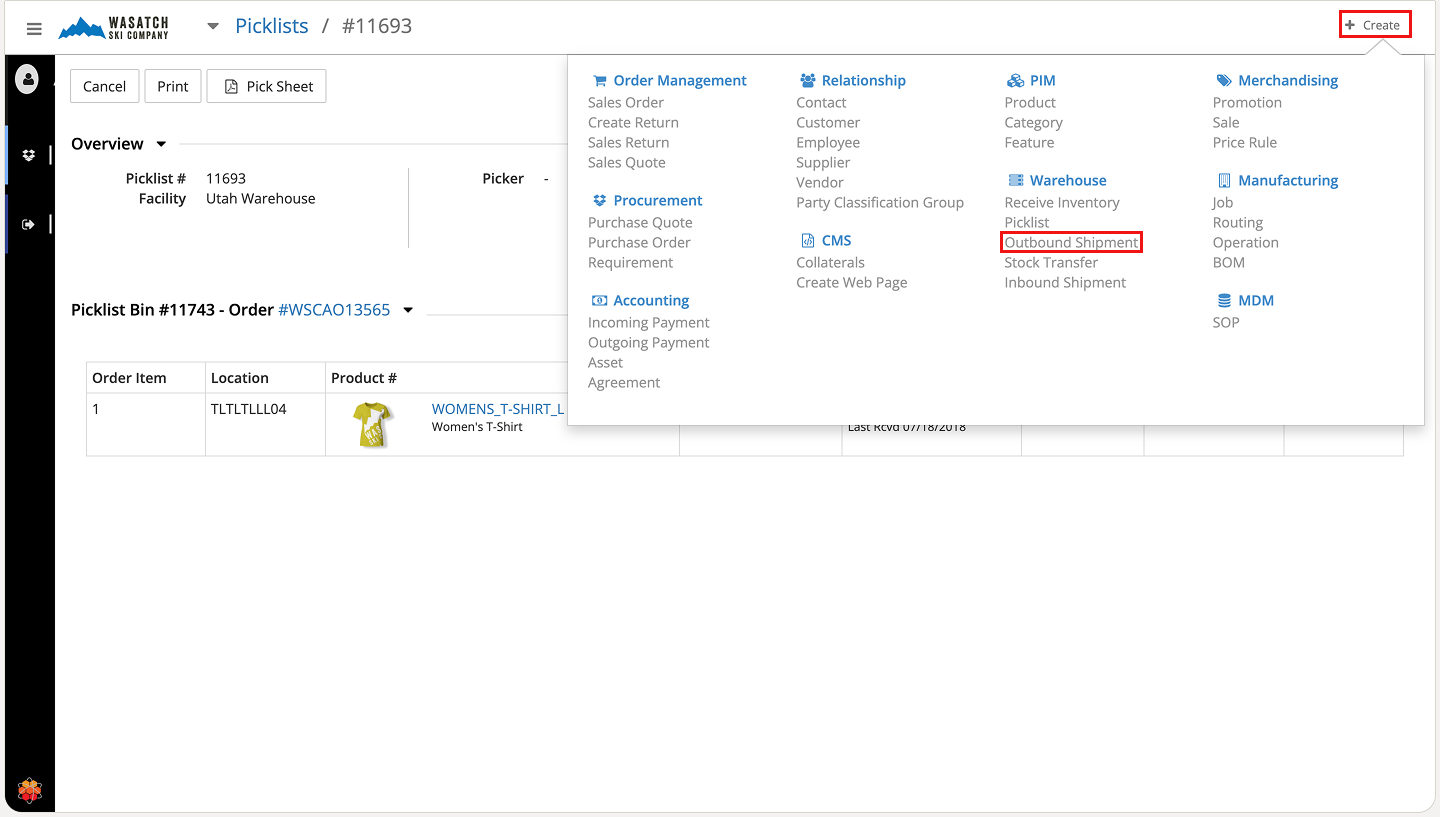 From any screen, click + Create in the top-right corner. In the dropdown menu, under the Warehouse section, select Outbound Shipment to begin preparing the order for dispatch.