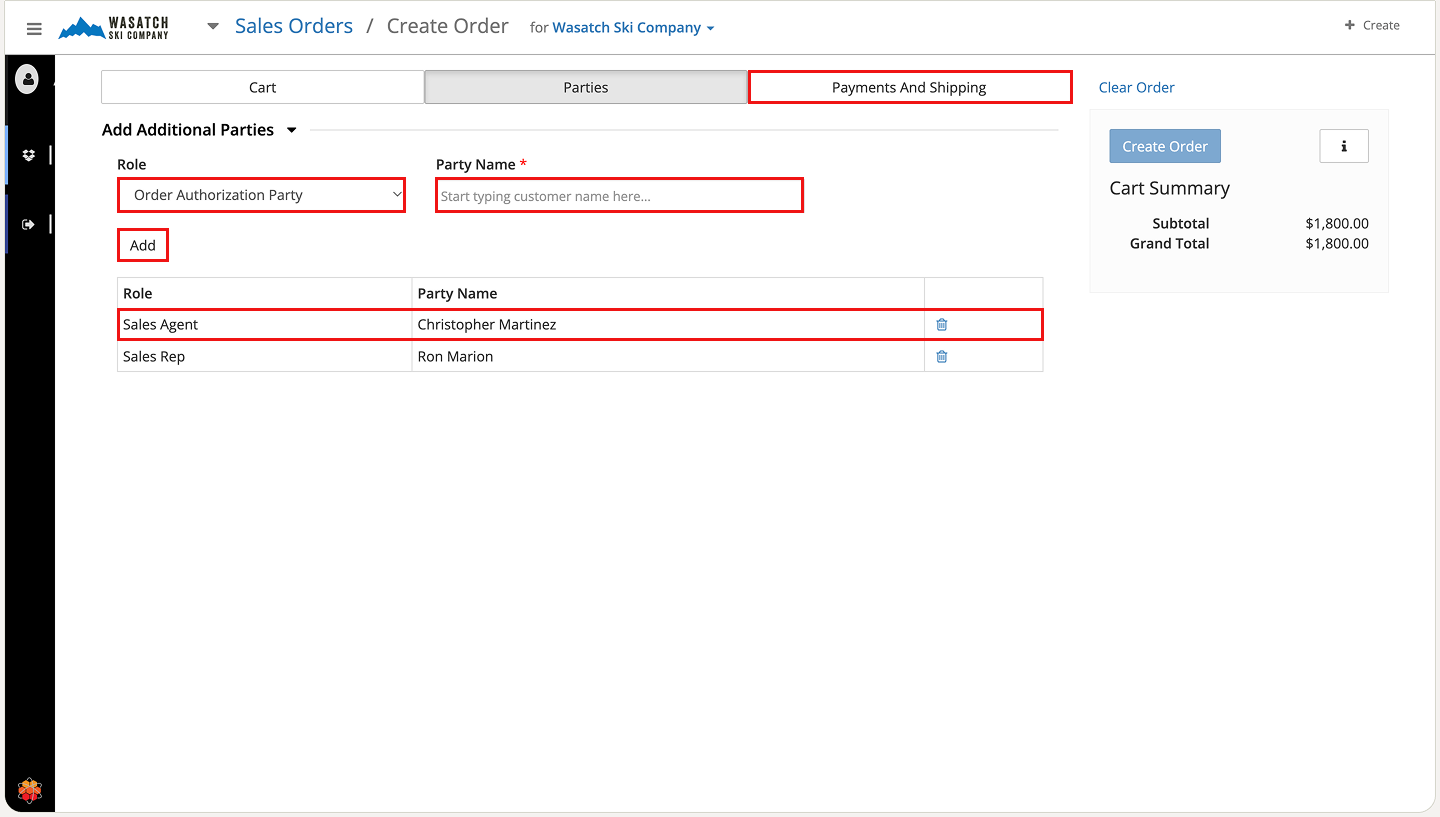 Click the Parties tab. Search for and add relevant parties (e.g., sales agent, sales representative) by entering the Party Name, selecting the appropriate Role from the dropdown, and clicking Add. Added parties appear in the list below for verification.
