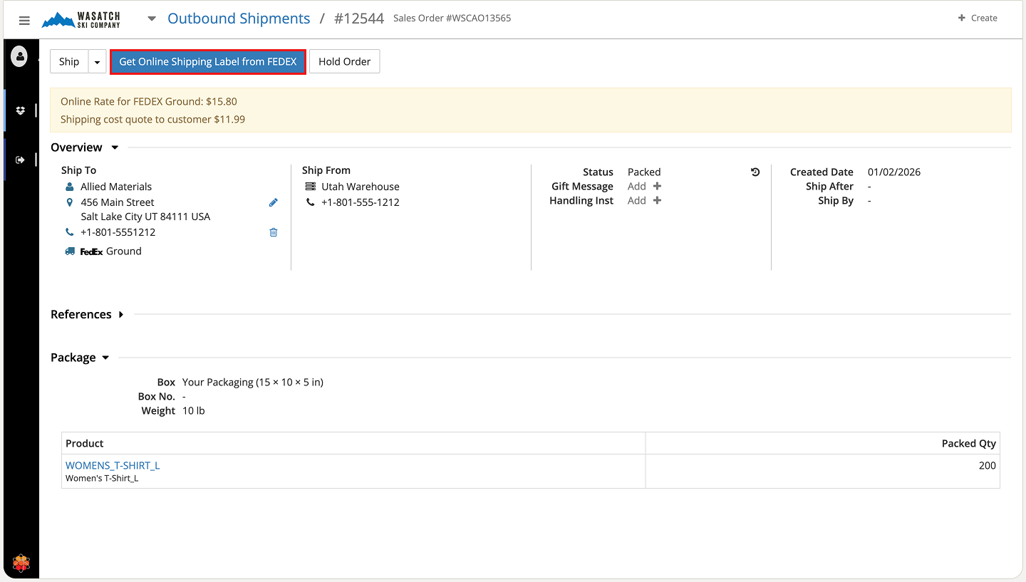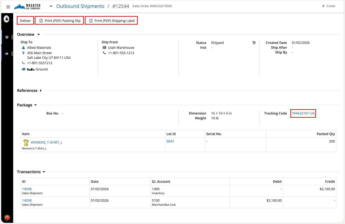 - Download the Packing Slip and Shipping Label via the respective buttons for warehouse use and carrier attachment.