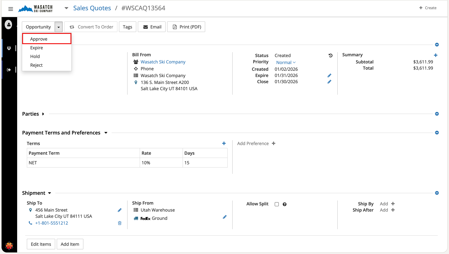 In the top-left status dropdown, select Approve to move the quote forward internally.