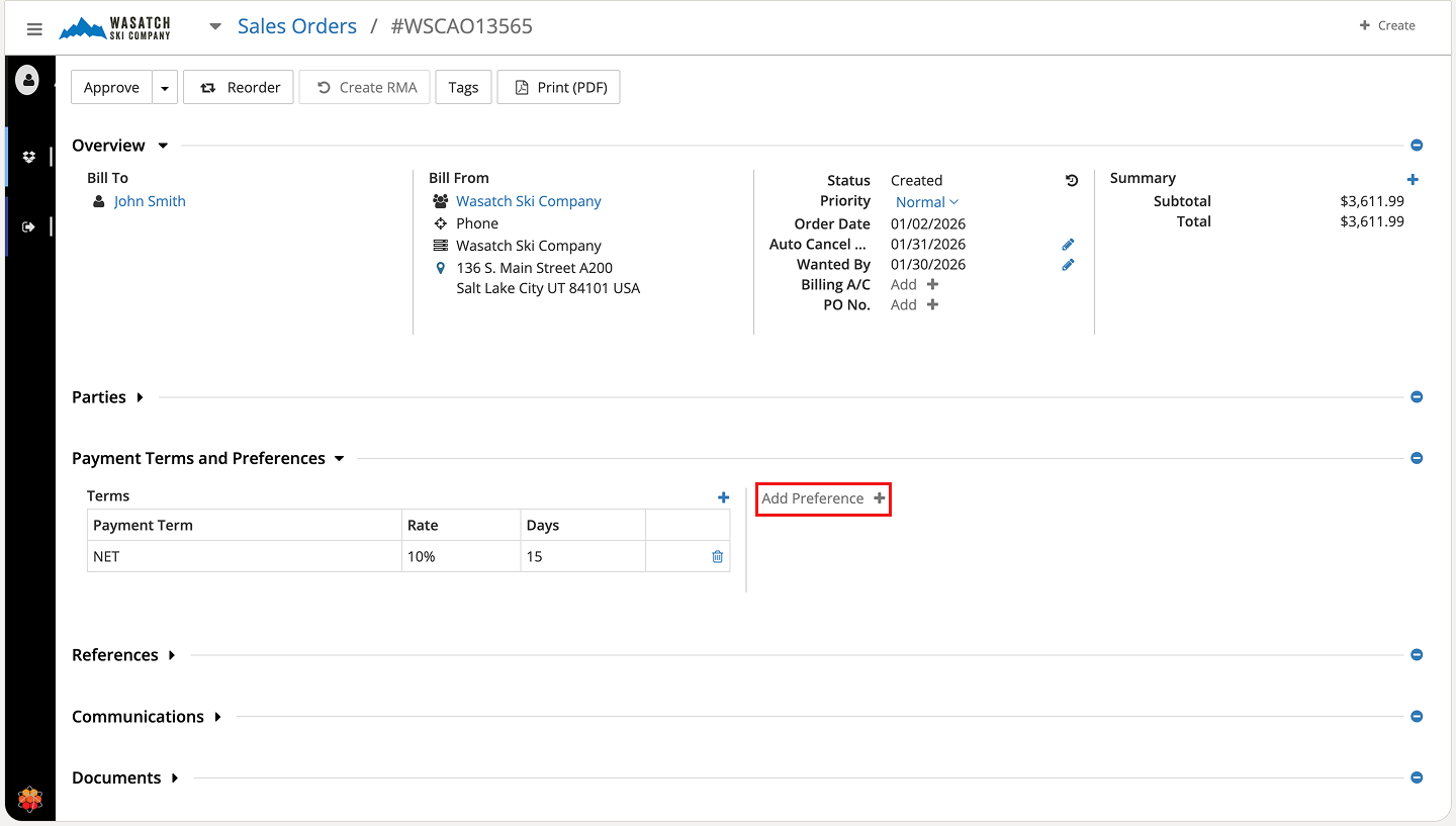 Once the customer accepts, return to the Payment Terms and Preferences section and click Add Preference +.