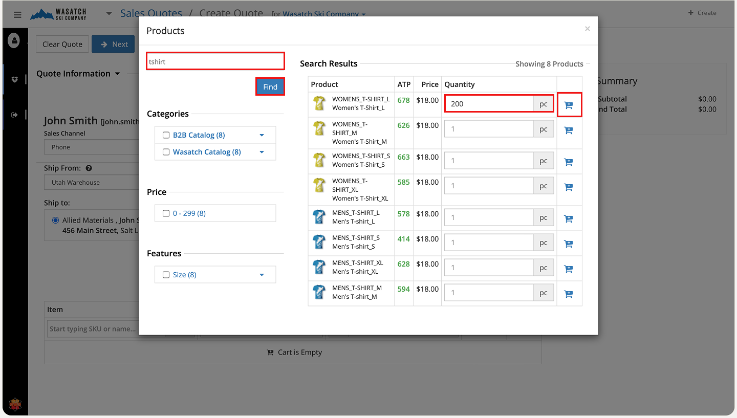 The product catalog pop-up opens. Use the top-left search bar or apply filters to locate items quickly. Once found, enter the desired quantity in the highlighted field and click the blue Cart icon to add the item with that quantity to the quote.
