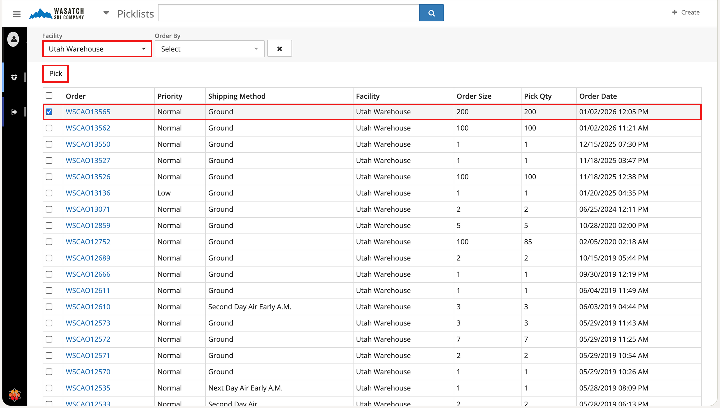 Select the order by checking the adjacent checkbox and click Pick to generate the pick list and begin the picking process.