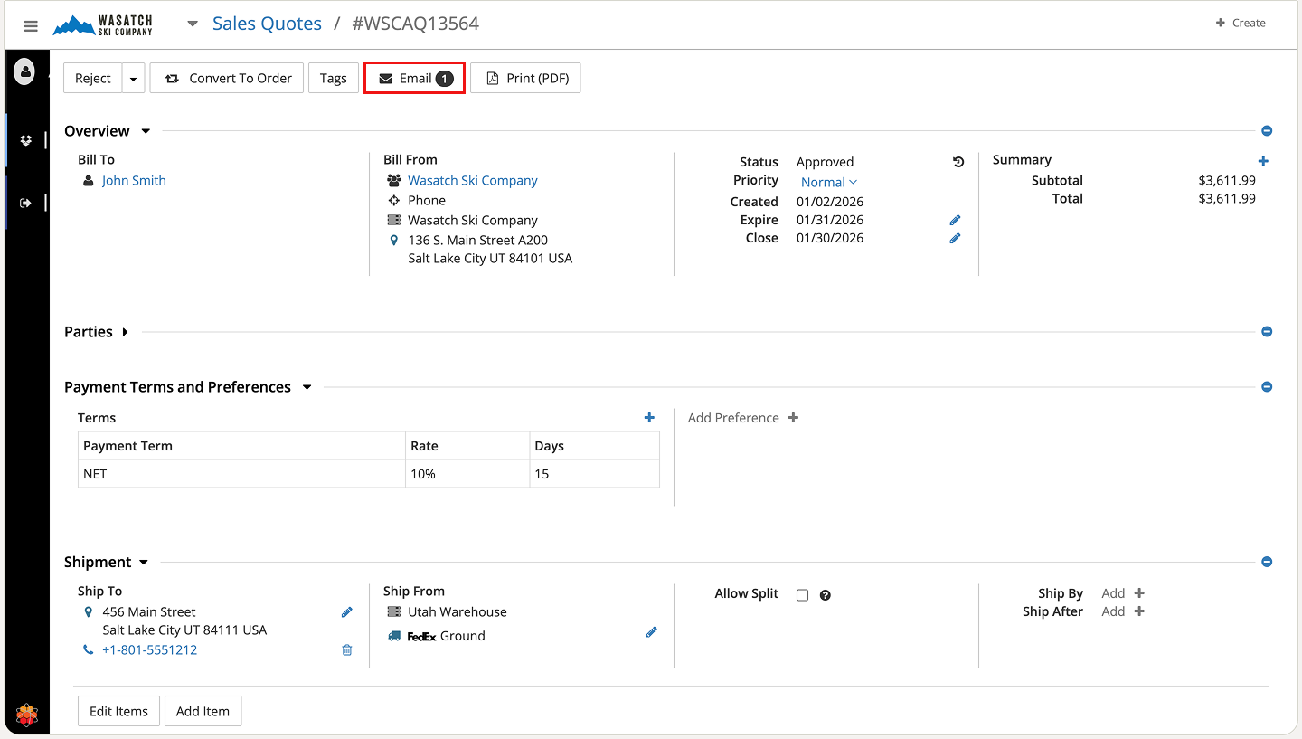 - Sales Quote: An optional preliminary step to propose items, pricing, and terms to a customer. Quotes can be emailed, approved, and converted directly into sales orders.