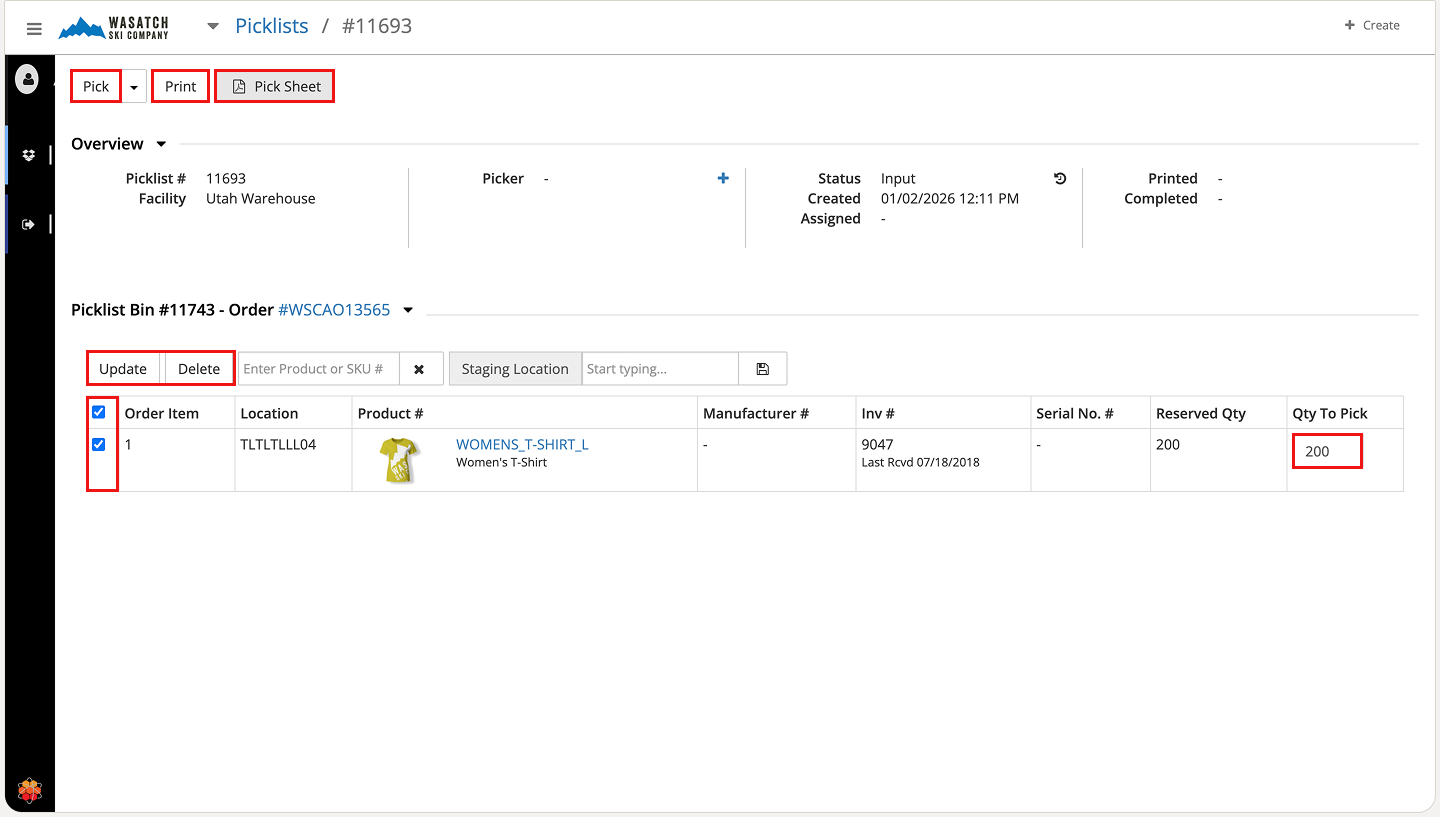 - Adjust Quantity: Select the checkbox next to the item, update the quantity in the Qty To Pick field, and click Update to save the change.
