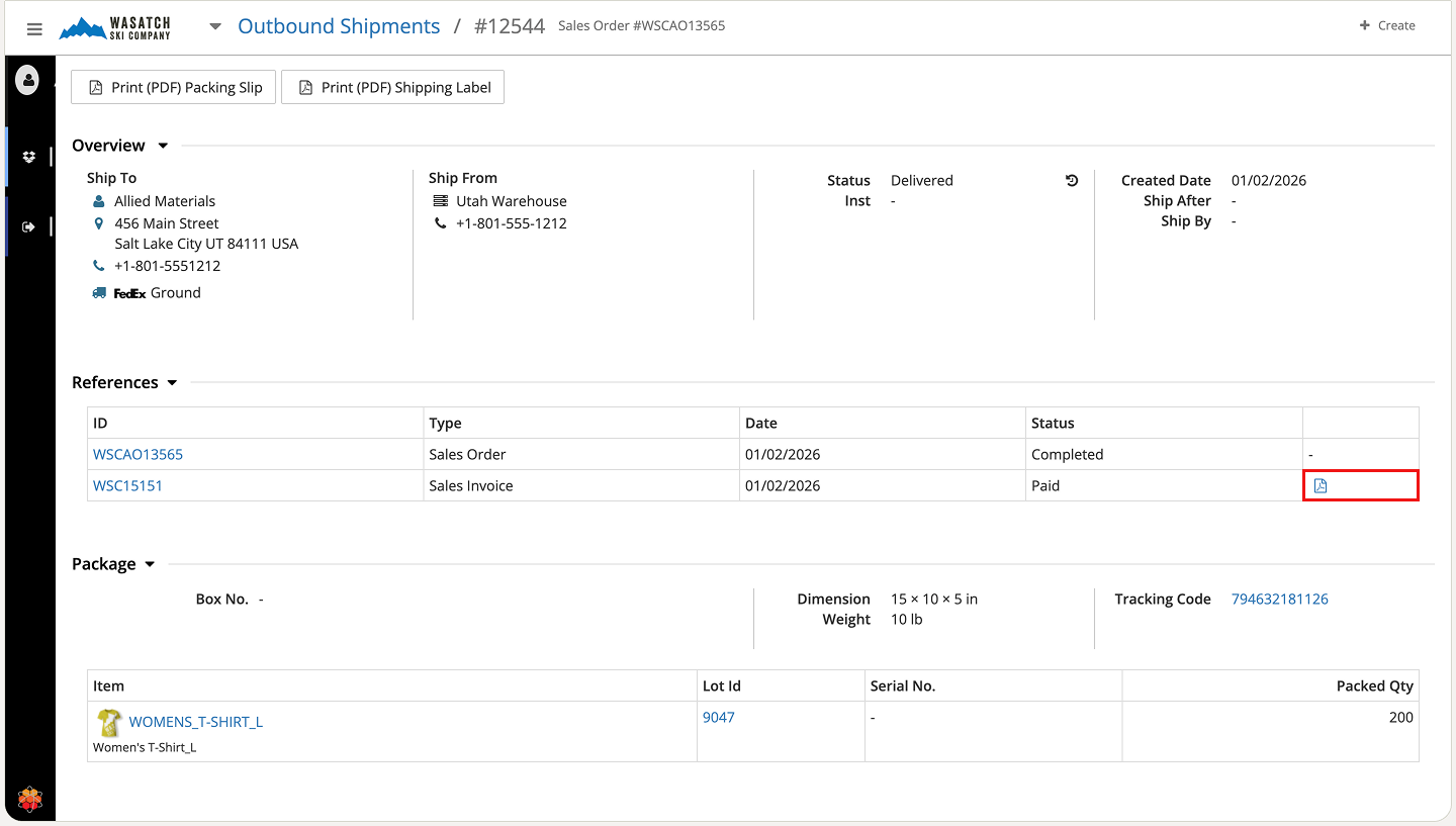 For reference or customer communication, click the PDF icon under the References section to view or download the final customer invoice, including all applied shipping charges.