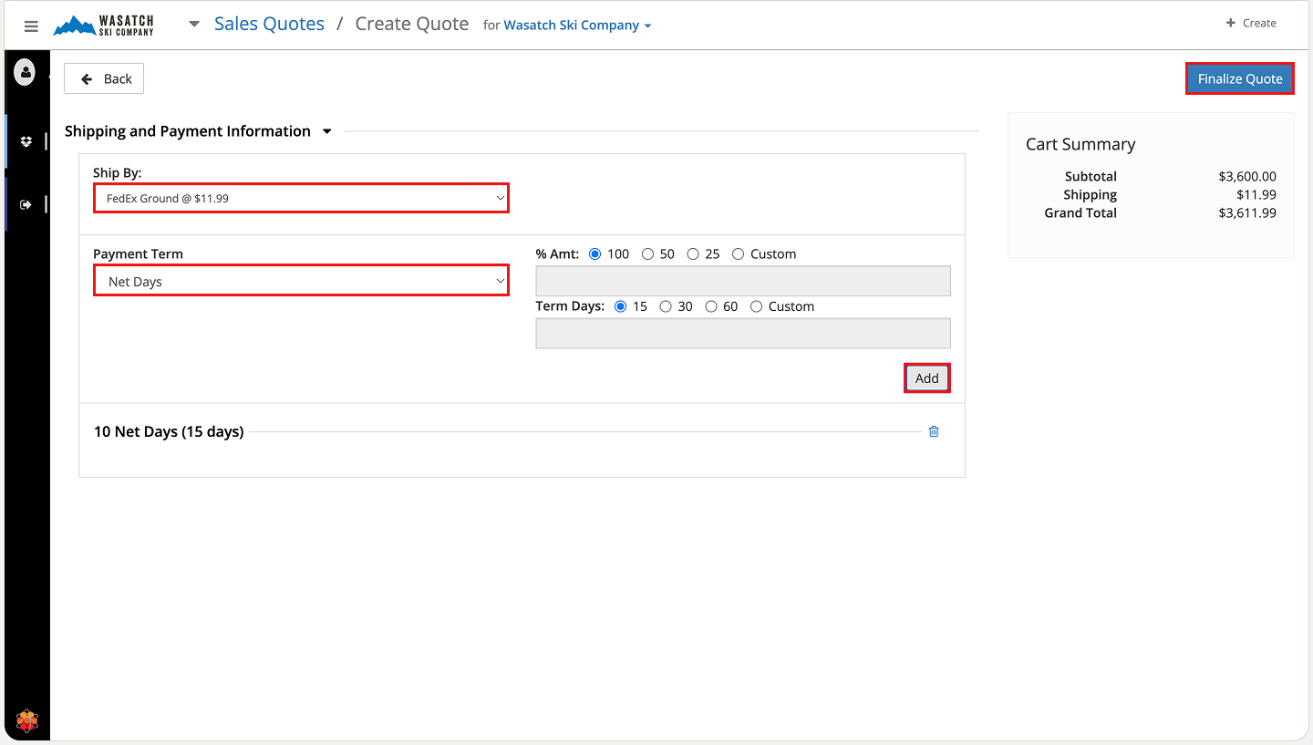 Add the preferred shipping method and payment terms. Review all details carefully, then click Finalize Quote to complete the draft.