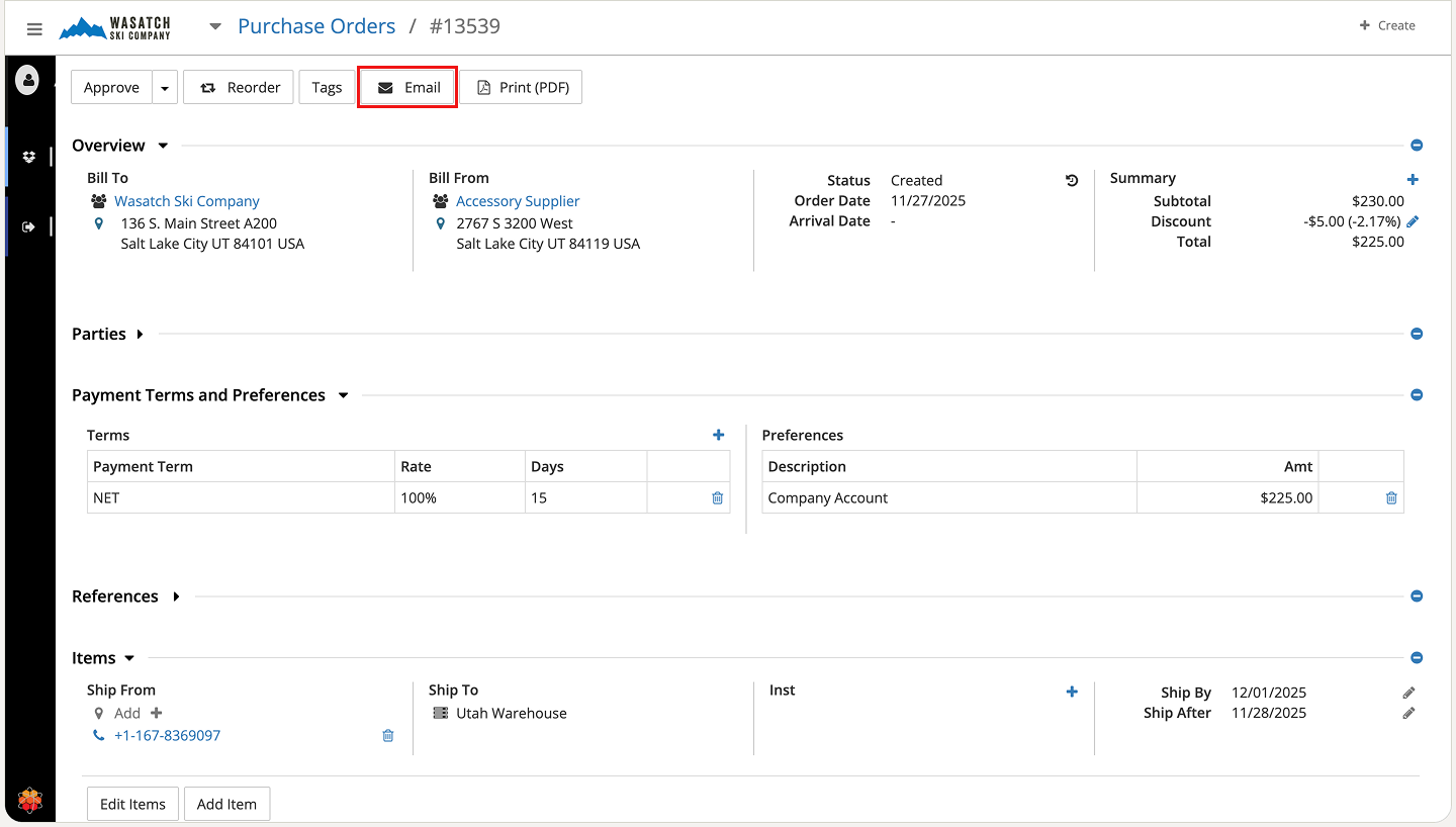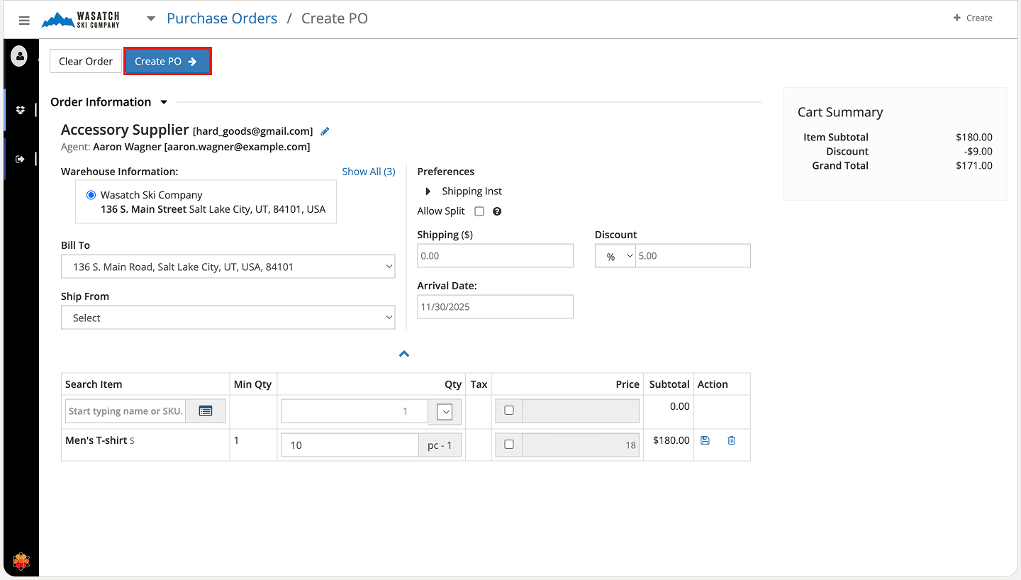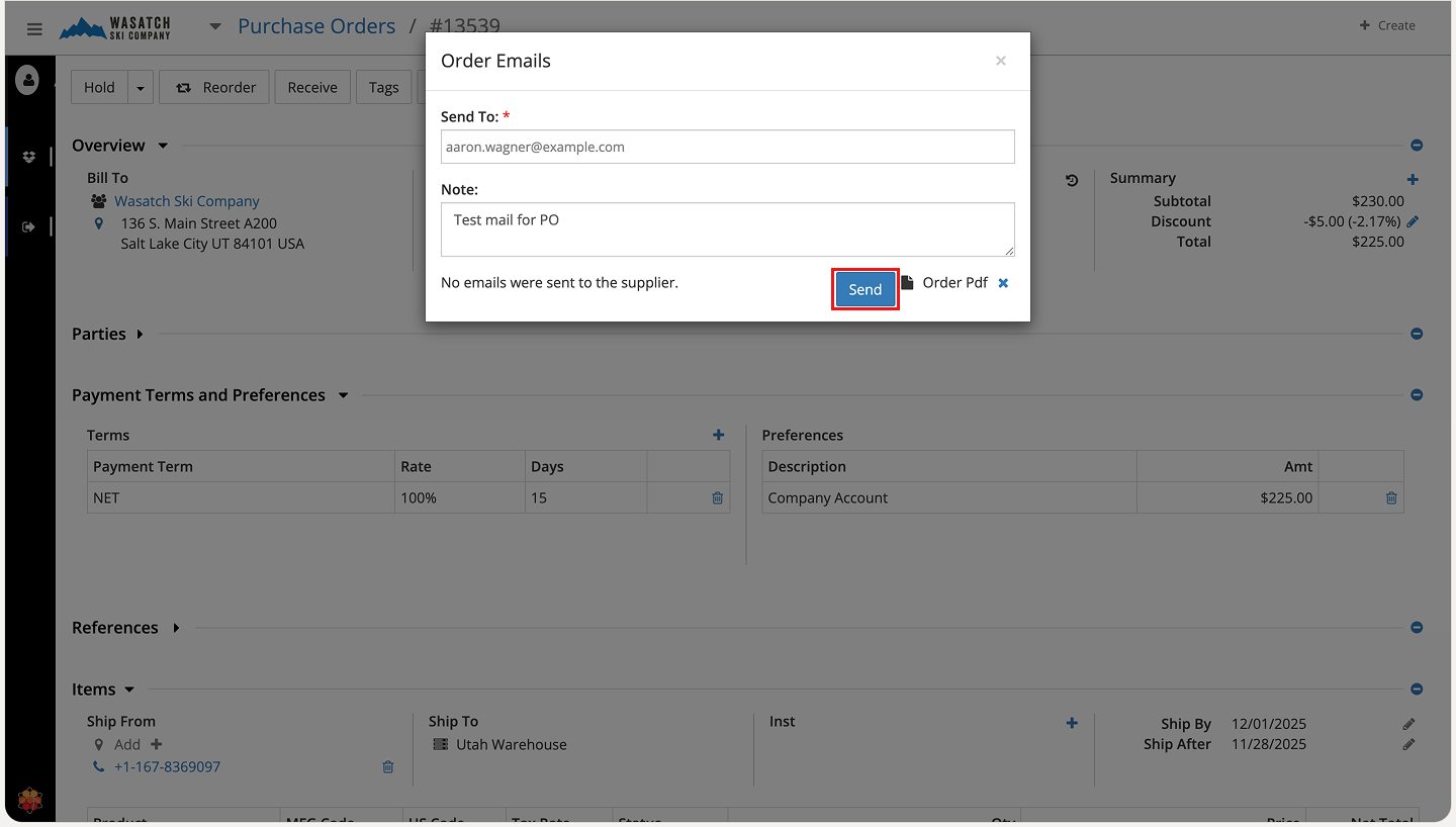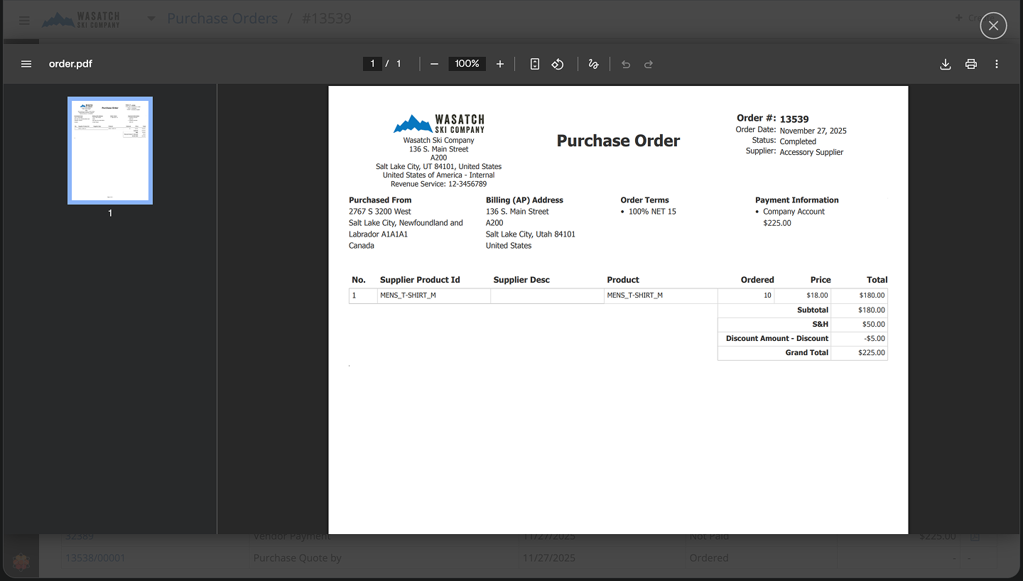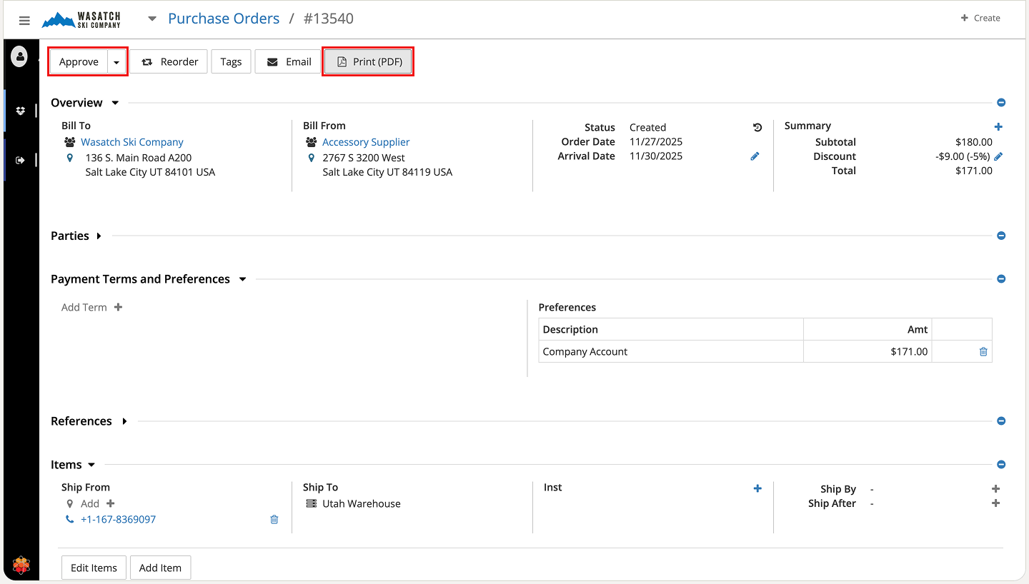 (Optional) Click Print (PDF) to download a printable version of the PO.