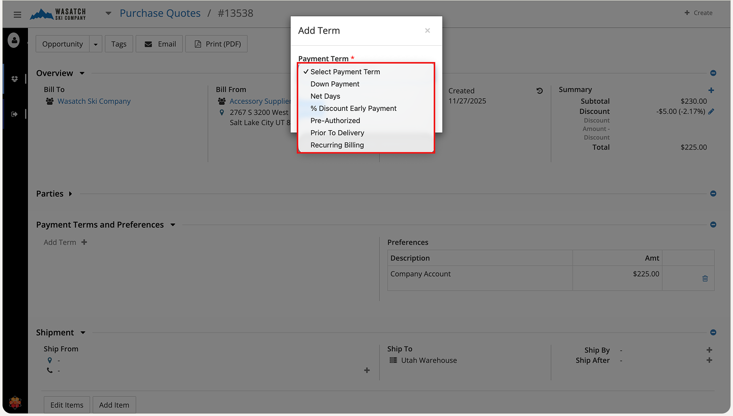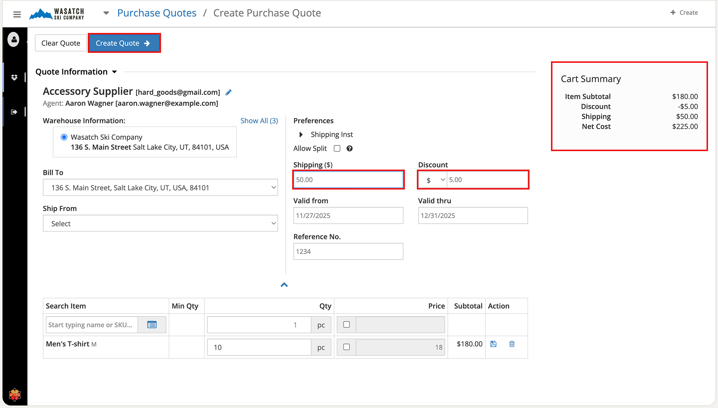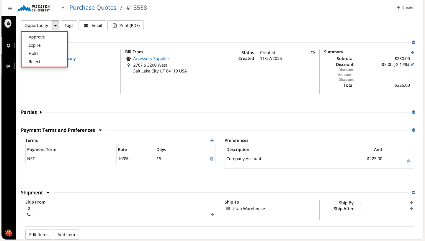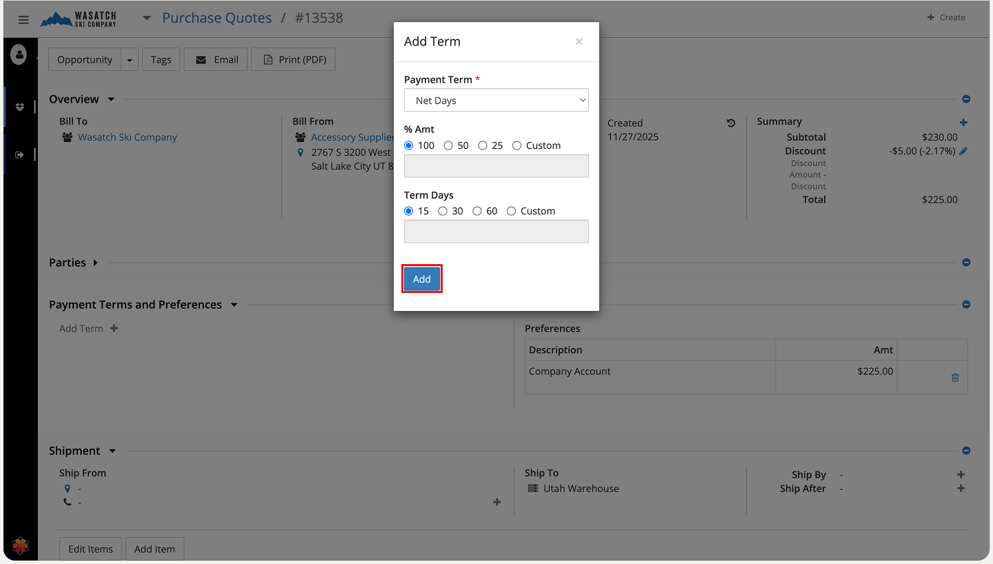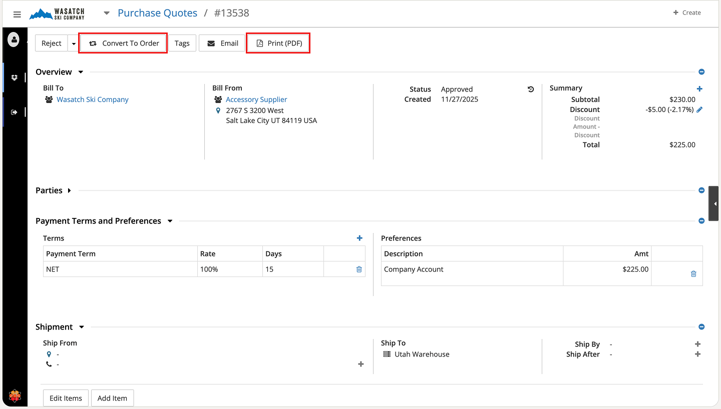 (Optional) Click Print (PDF) to generate a printable version of the purchase quote.