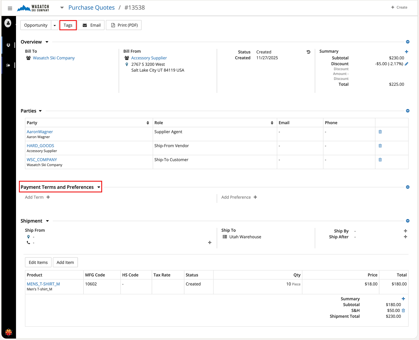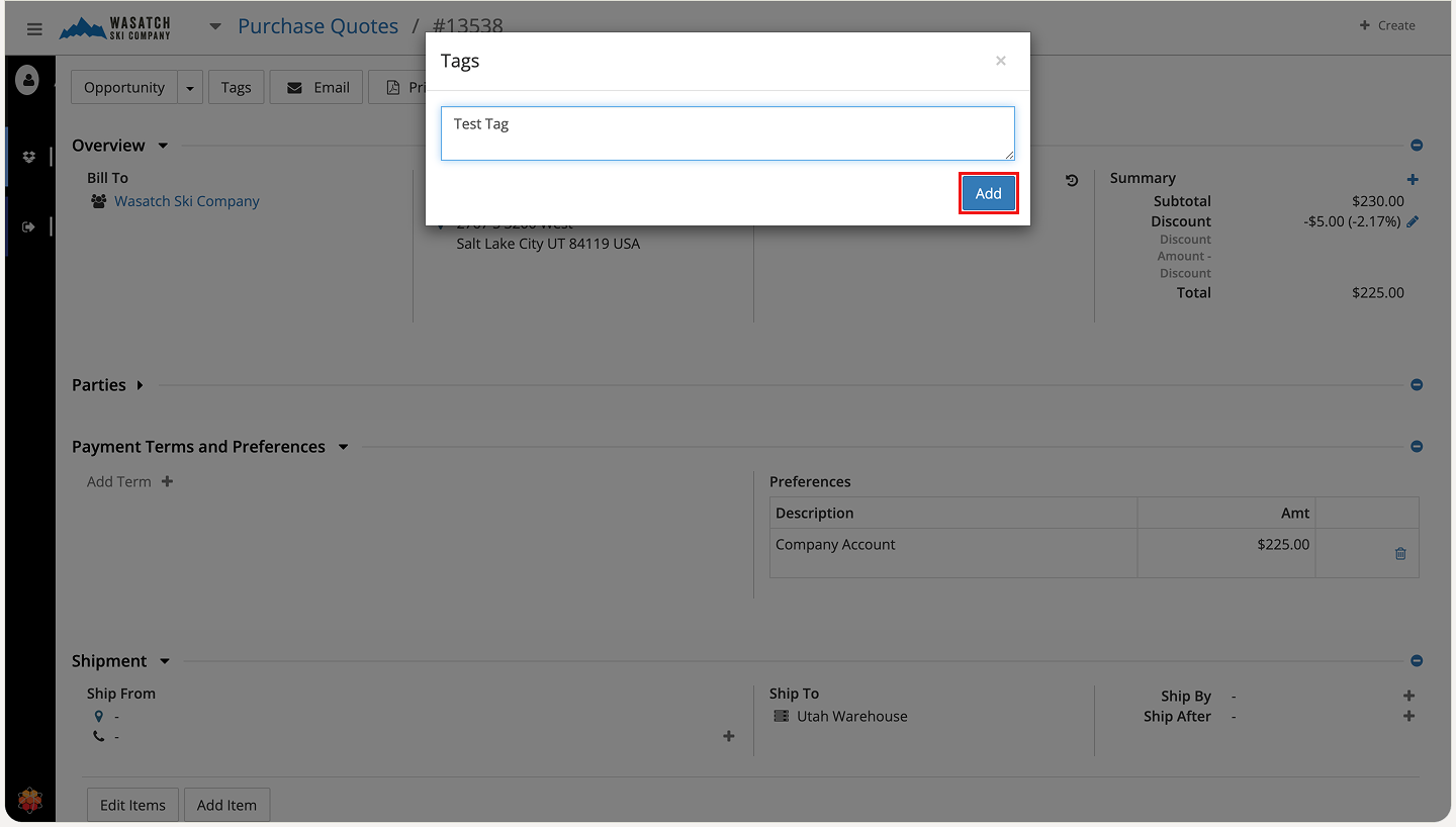 Step 7 - On the quote screen, click Tags to add tags for tracking.