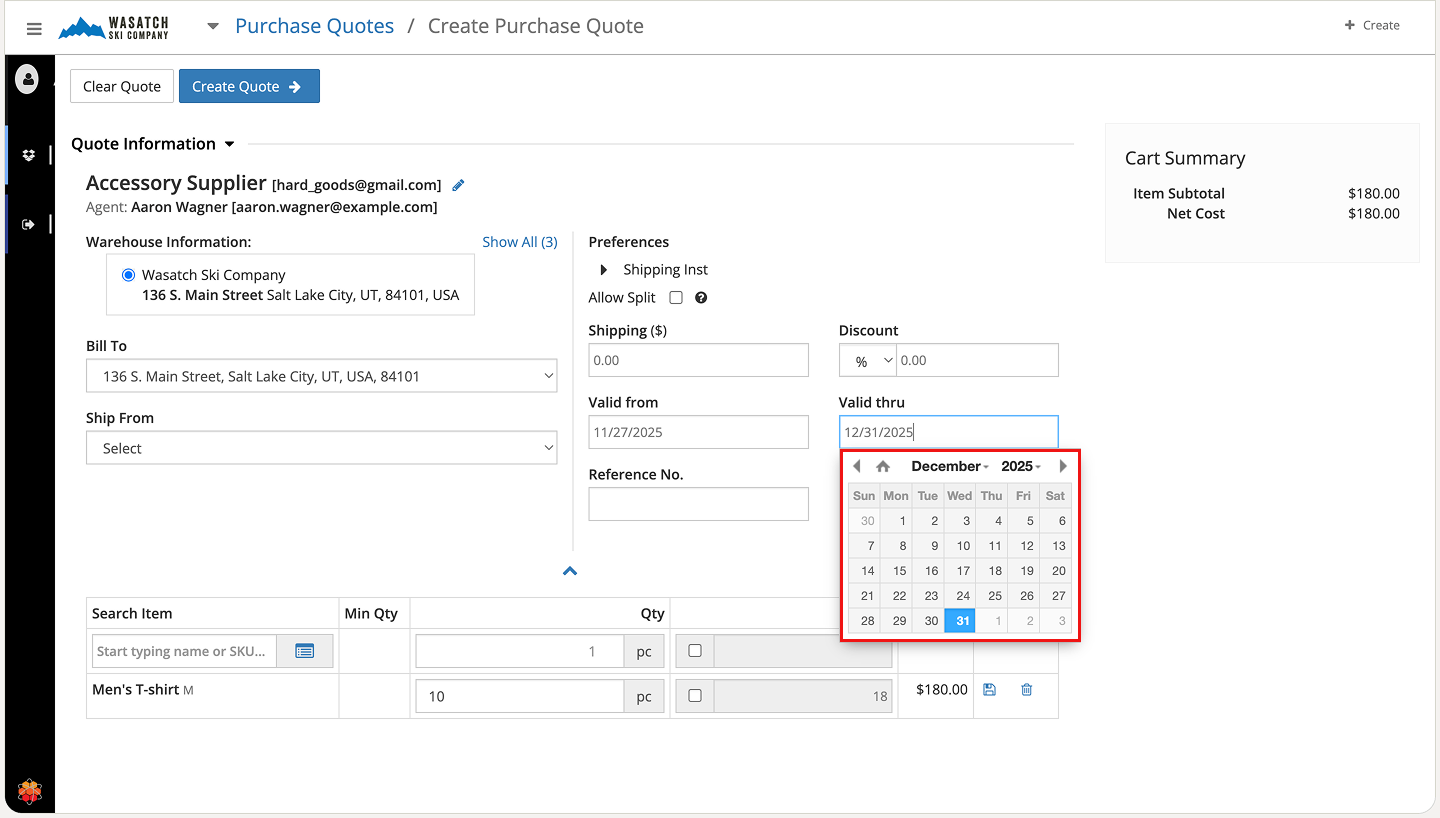 Select Valid From and Valid Thru to set the quote’s expiry range.