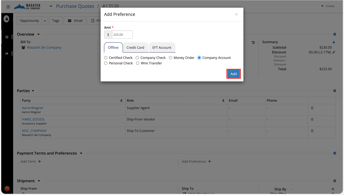 Step 8 - Click Add Preference + under Payment Terms and Preferences.