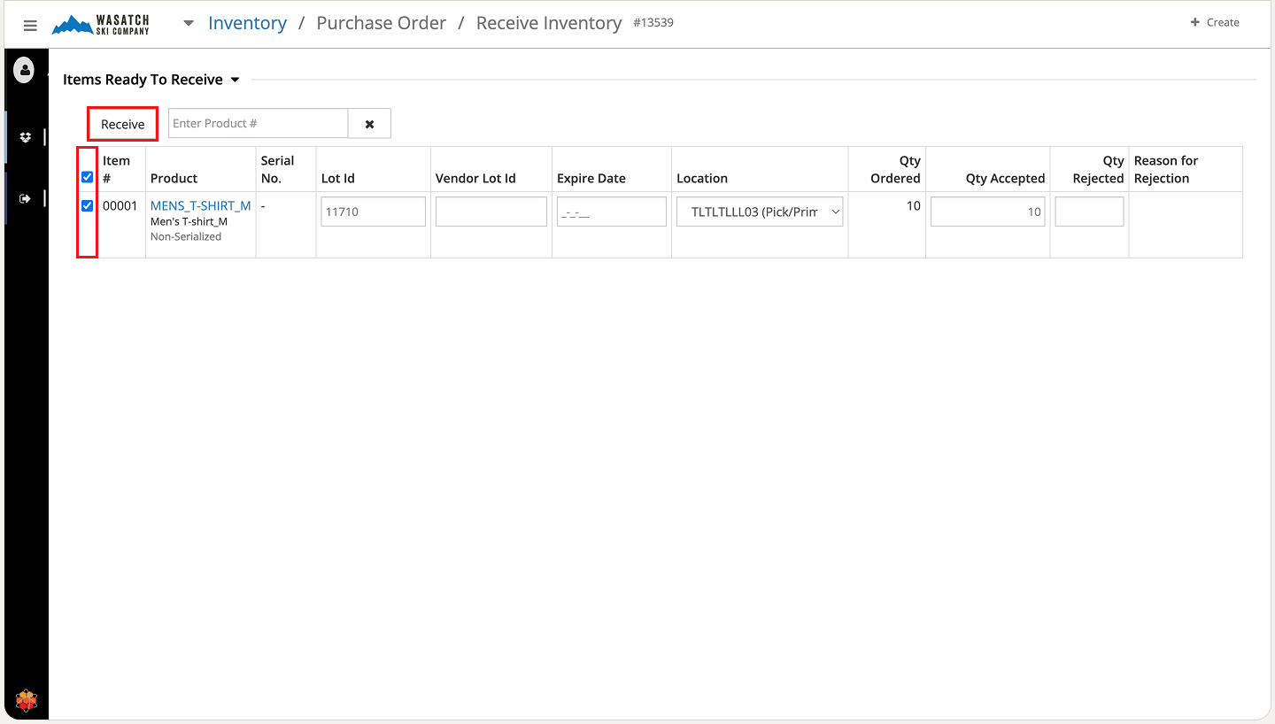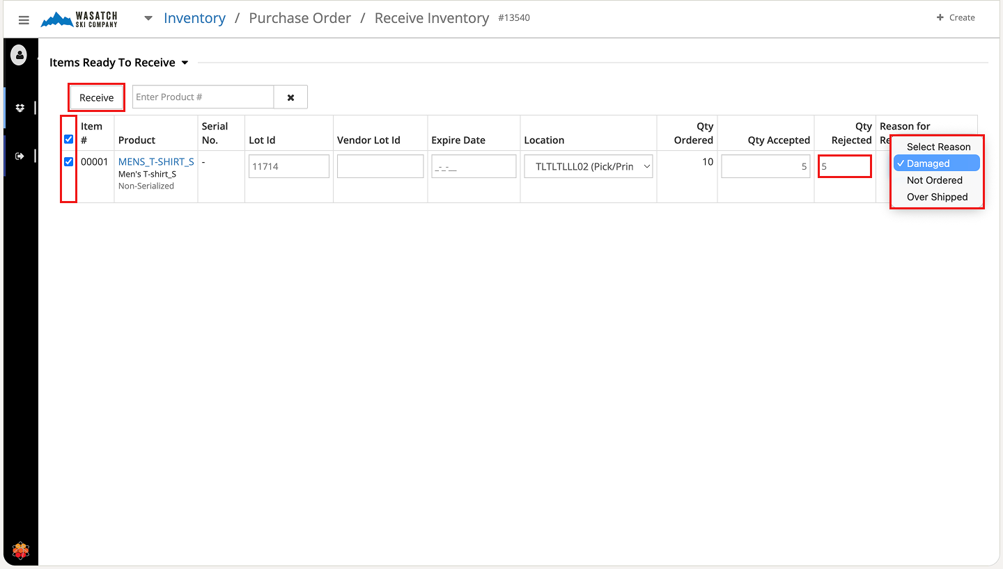 During receiving, you can accept all or part of the delivery. You can also enter rejected quantities along with a rejection reason. Rejected quantities do not increase inventory.