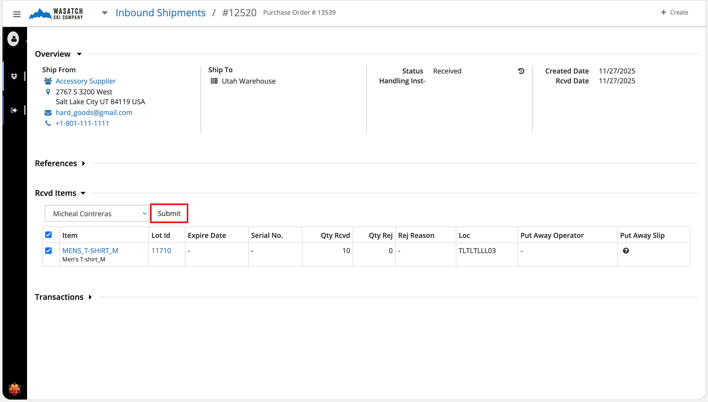 Step 4 - Click Submit to complete the put-away process.