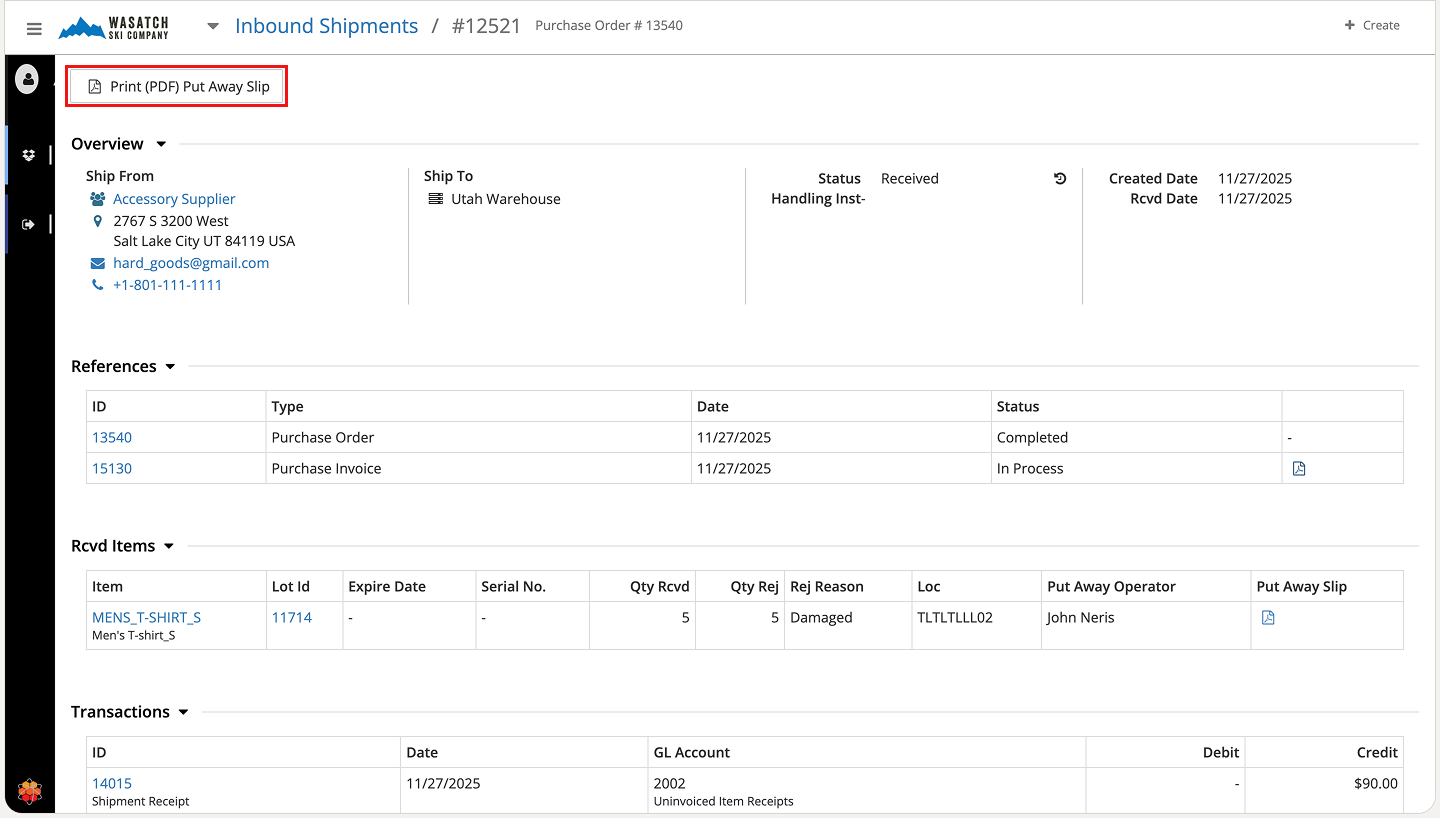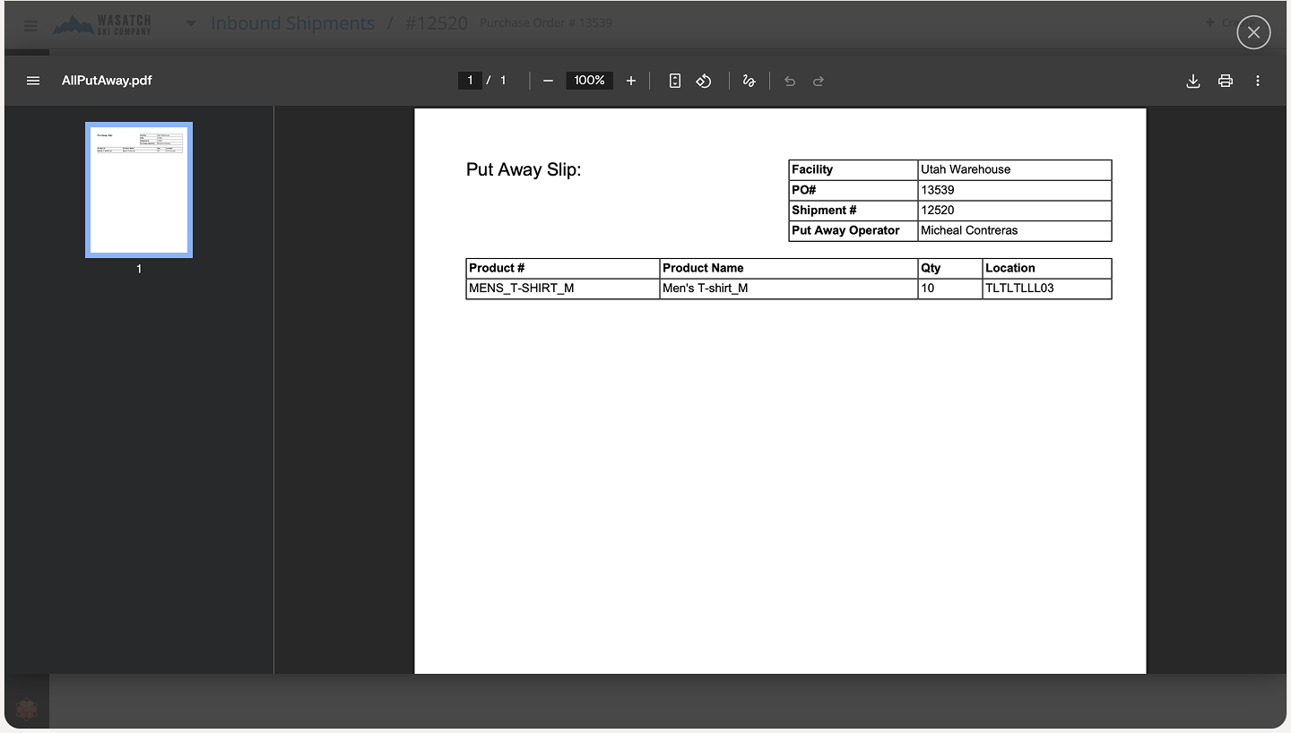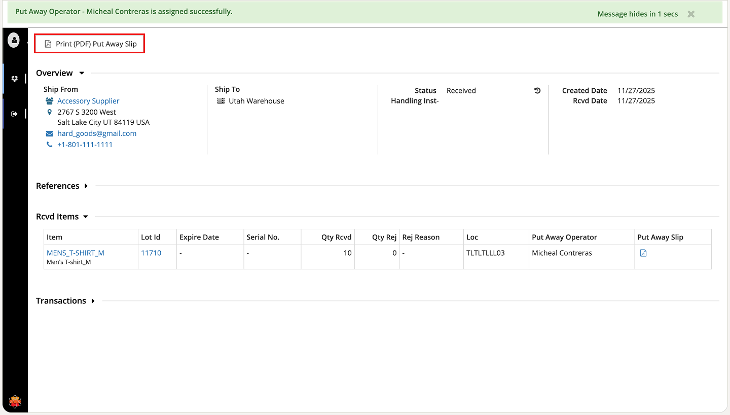 Click Print (PDF) Put Away Slip to download the slip for your records.