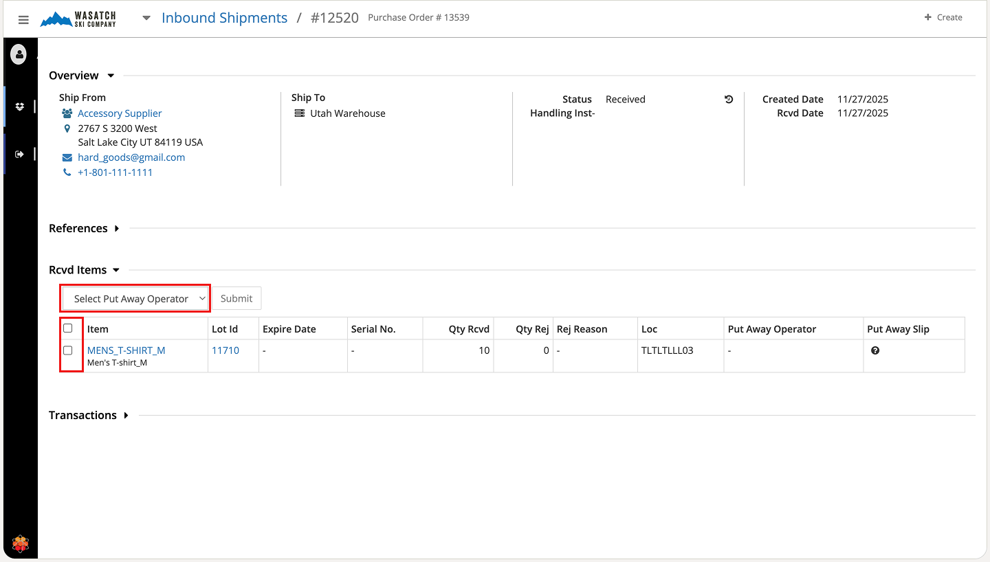 Step 4 - On the put-away screen, select the items to put away and choose the Operator from the dropdown.