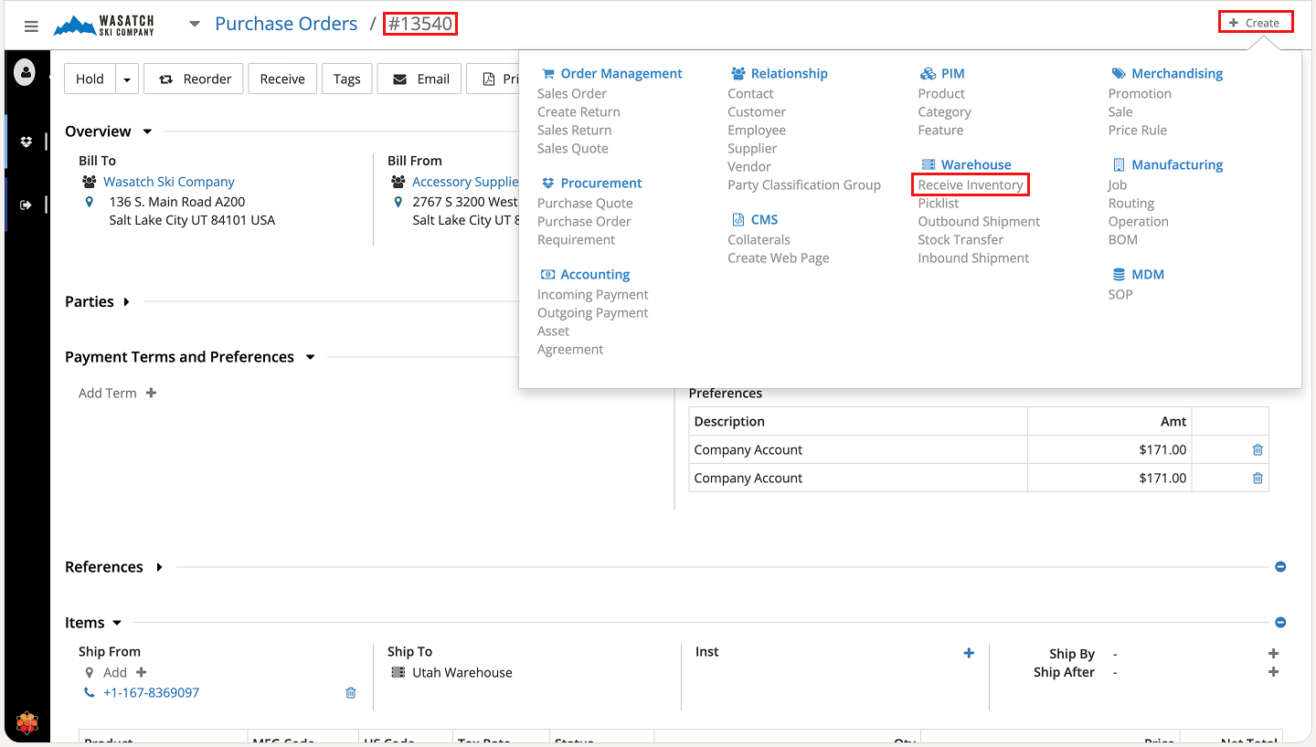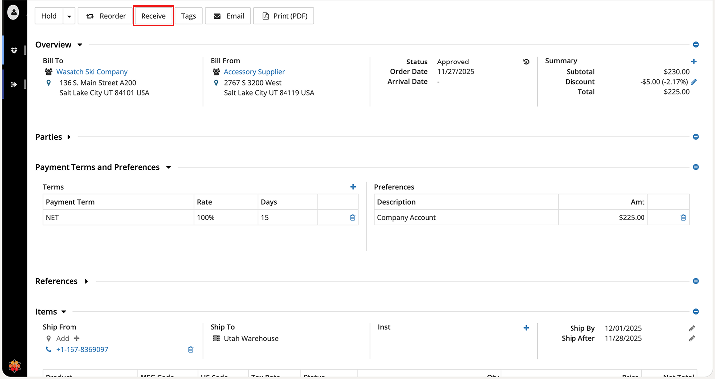 Receiving through purchase order